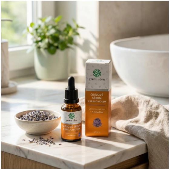 Olejové sérum od Green idea staví na síle bakuchiolu – přírodní látky získávané ze semen rostliny Psoralea corylifolia, která pokožku podporuje v jejím vlastním rytmu. Podobně jako retinol napomáhá zjemnit vrásky a sjednotit tón pleti, ale bez zvýšené citlivosti a bez nutnosti postupné adaptace pokožky.