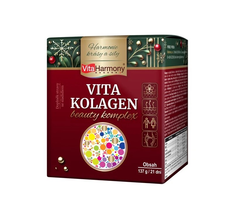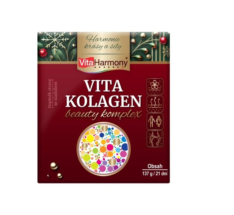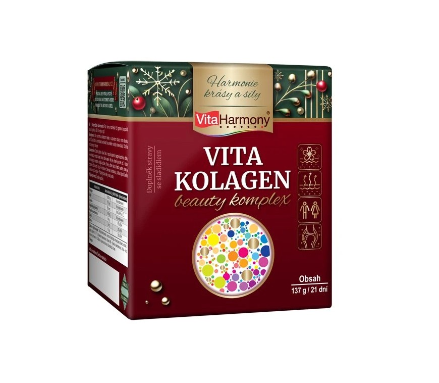 VitaKolagen je doplněk stravy, navržený pro podporu zdraví vaší kůže, kloubů, vlasů a nehtů. Přípravek obsahuje v jedné dávce 5000 mg klinicky testovaného hydrolyzovaného rybího kolagenu, který je velmi dobře vstřebatelný a je zcela zbavený nežádoucích zápachů. Jedná se o 3 týdenní kůru, která je vhodná pro ty, kteří chtějí podpořit svou kůži, aby zůstala pružná a jasná, chtějí udržet své klouby a kosti silné, nebo chtějí zlepšit kvalitu i hydrataci vlasů, nehtů a pleti.
